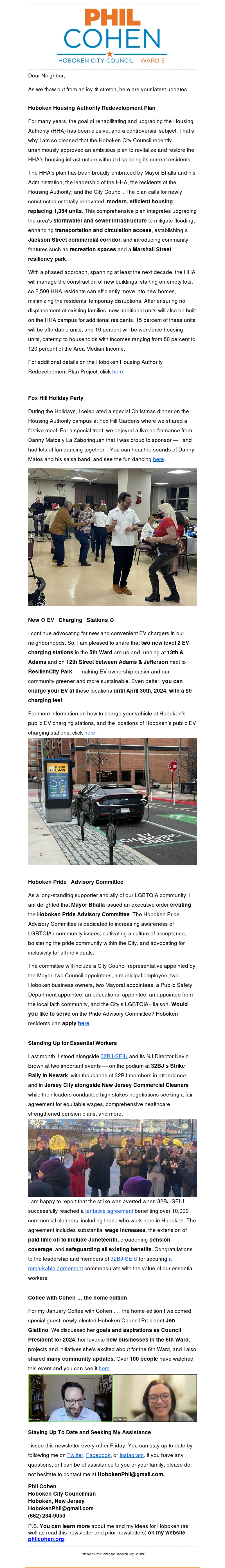 JANUARY 26TH 2024 NEWSLETTER: MAJOR MILESTONE FOR HOBOKEN HOUSING AUTHORITY, NEW ♻️ EV 🚙 CHARGING STATIONS, HOBOKEN PRIDE 🏳️🌈 ADVISORY COMMITTEE, AND MORE January 26, 2024 Phil Cohen